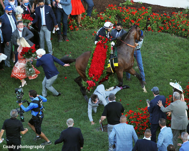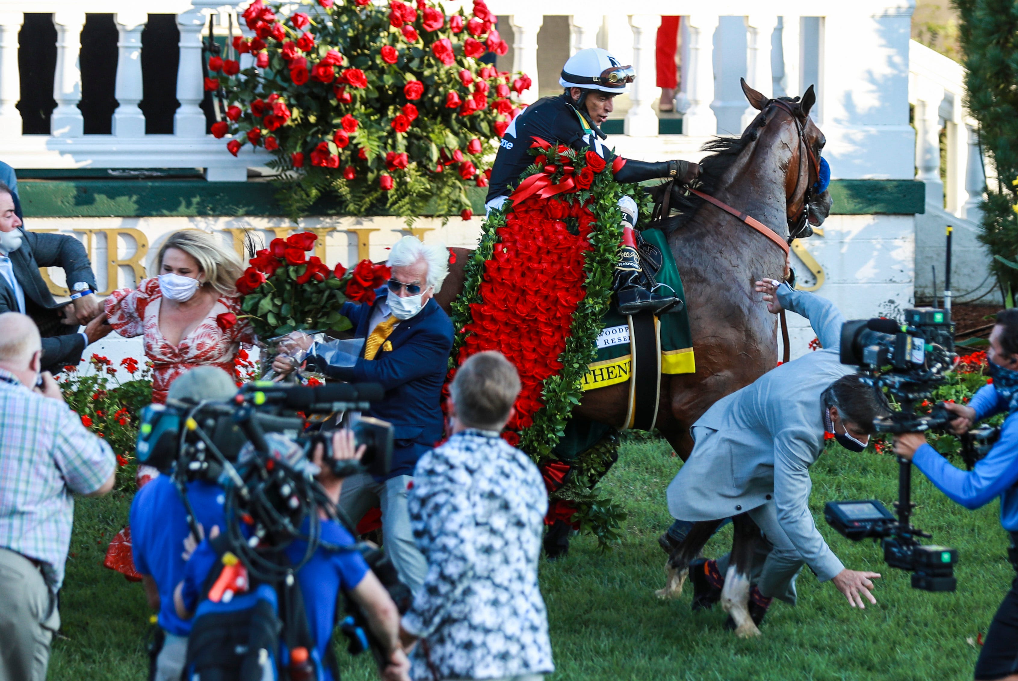 After the garland of roses was placed on authentic, the derby champion spooked and circled around wildly on the churchill downs turf course, the de facto winner's circle on derby day.