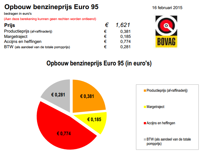 De benzine prijs is opgebouwd uit verschillende delen. Productieprijs de productieprijs wordt bepaald door de inkoopprijs van olie, plus de raffinagekosten voor de productie van olie tot benzine. In de prijs van een liter euro 95 exclusief belastingen (60 eurocent in juli 2015) zitten naast de kosten voor de ruwe olie ook productiekosten. In november heeft minister economische zaken maxime verhagen de opbouw van de benzineprijs laten onderzoeken. In maart 2012 bestond ruim 57 procent van de prijs van een liter euro95 uit belasting.